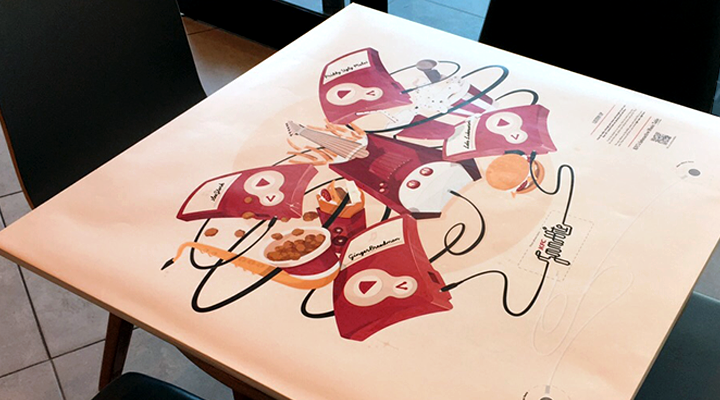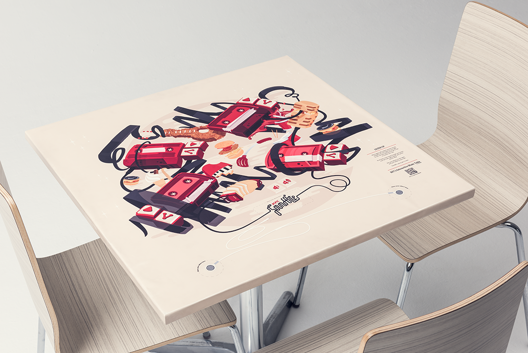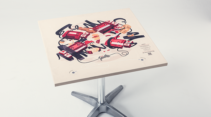 The tables boasted illustrations by local artists to create branded digital touch tables where customers could touch table graphics to play tracks, and initiate further distribution of their music through social sharing.