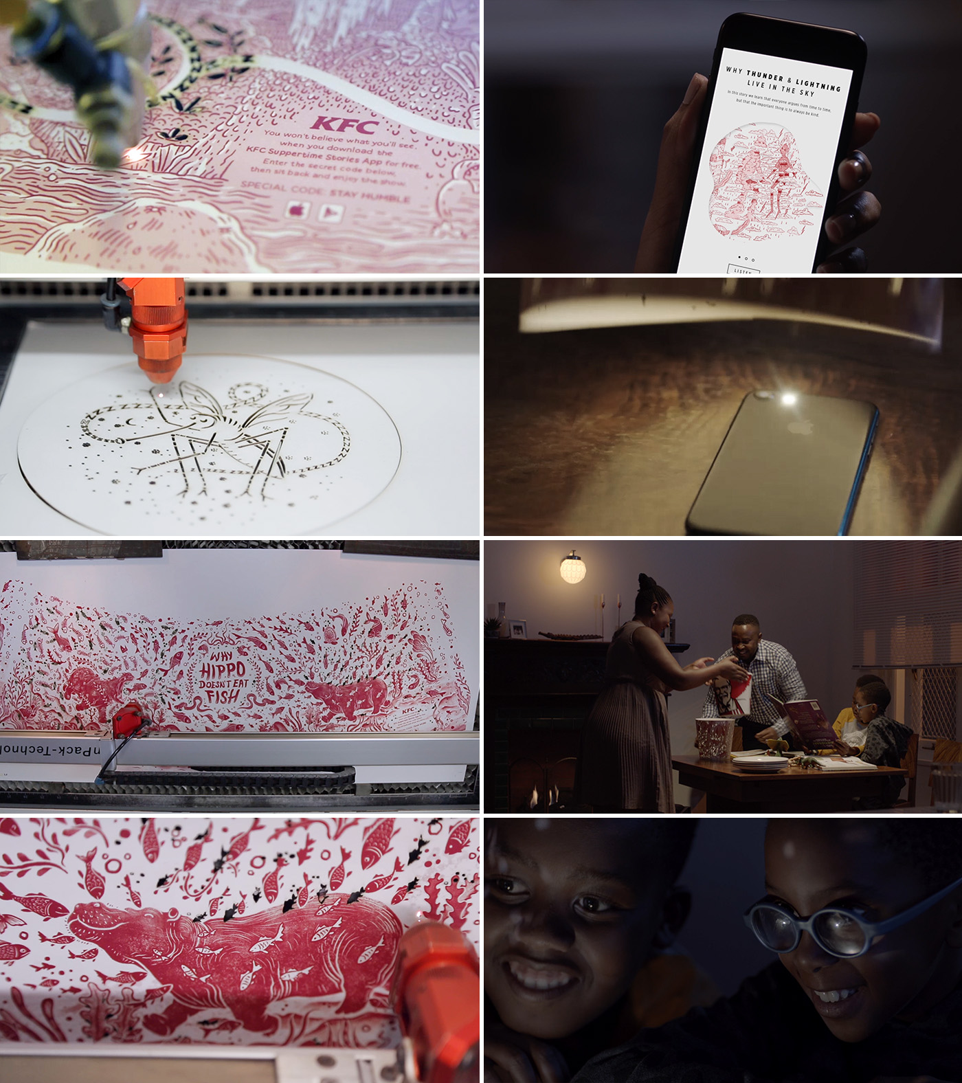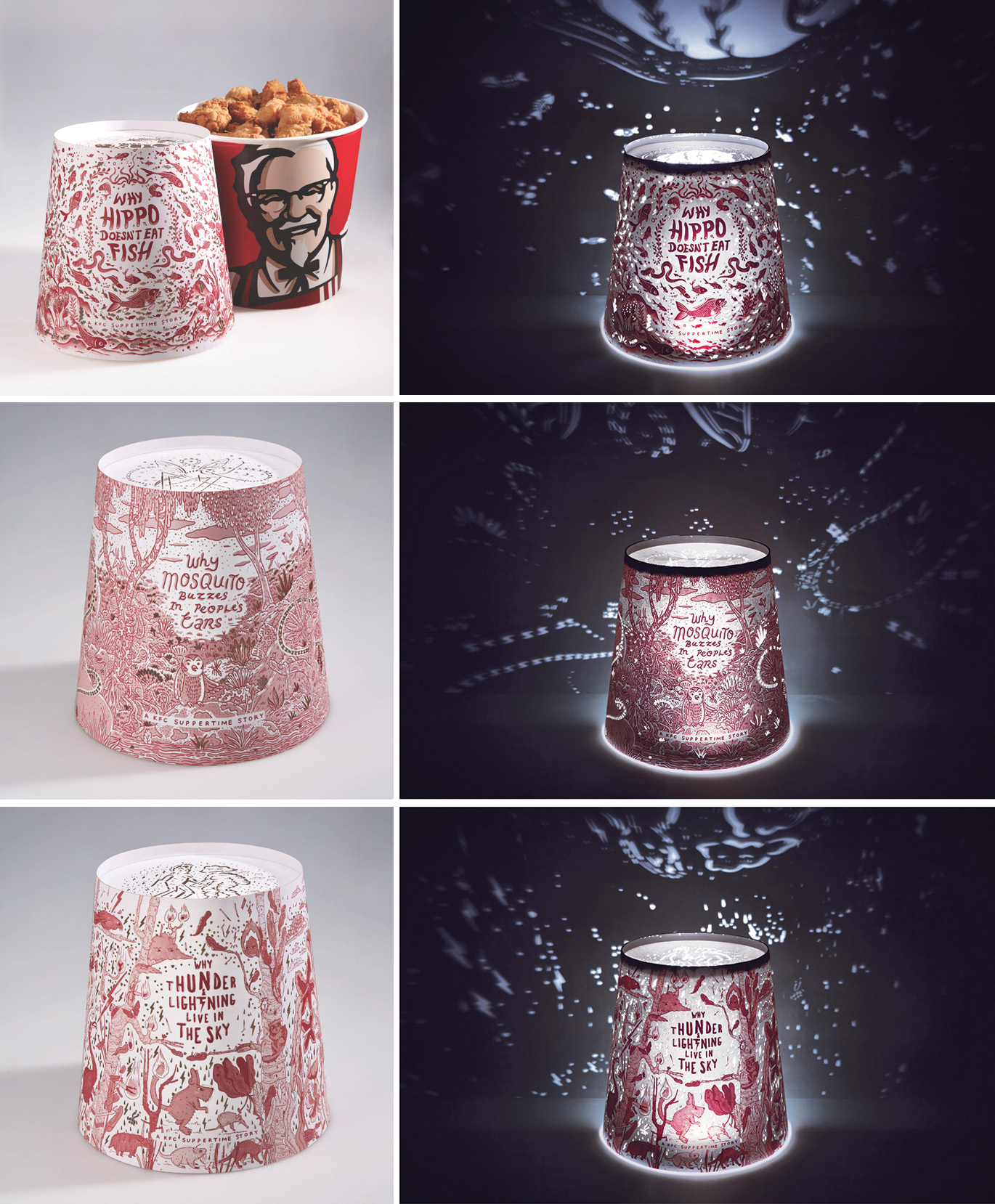 Bespoke bucket sleeves directed customers to a mobile app, where they could unlock original suppertime stories. When placed face-down on the table, the phone’s proximity sensor automated the selected audio story, bringing the bucket to life with sound, light and vibration by utilising the phone’s speaker, flashlight and vibration functions. As audio played, the stories were animated by light projections that filtered through the illustrated and laser cut sleeves. Creating an interactive storytelling experience people could enjoy, while sharing a meal.